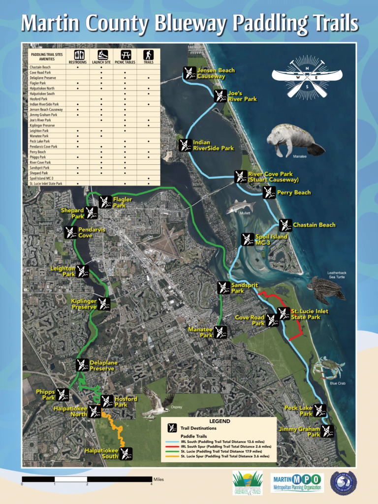 The Martin County paddling trails span 37.7 miles of two river systems – the Indian River Lagoon and St. Lucie River. The Indian River Lagoon portion of the trail is 16.2 miles long and stretches between Jensen Beach and Hobe Sound. This portion of the trail is a part of the Indian River Lagoon Aquatic Preserve. There are eight different public launch or stopover sites along the trail. There is also a 2.6-mile trail spur running through St. Lucie Inlet State Park.